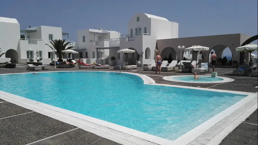 סנטוריני מציעה חופשה מכל הסוגים. אלה שמחפשים חופשת בטן גב ימצאו כאן כאמור מלונות בכל הרמות, שממוקמים באיזורים שונים באי. כך, למשל, המלונות בפירה מאוכלסים יותר על ידי משפחות ואילו המלונות באזור פריבולוס והחוף השחור, בדרום האי, הם מלונות שמתאימים יותר לזוגות ולחברה יותר צעירים. החוף השחור, שנחשב אטרקציה מרכזית, מלא לכל אורכו במסעדות ובברים מאוד מודרניים, והאיזור מהווה מרכז בילויים נוסף באי.